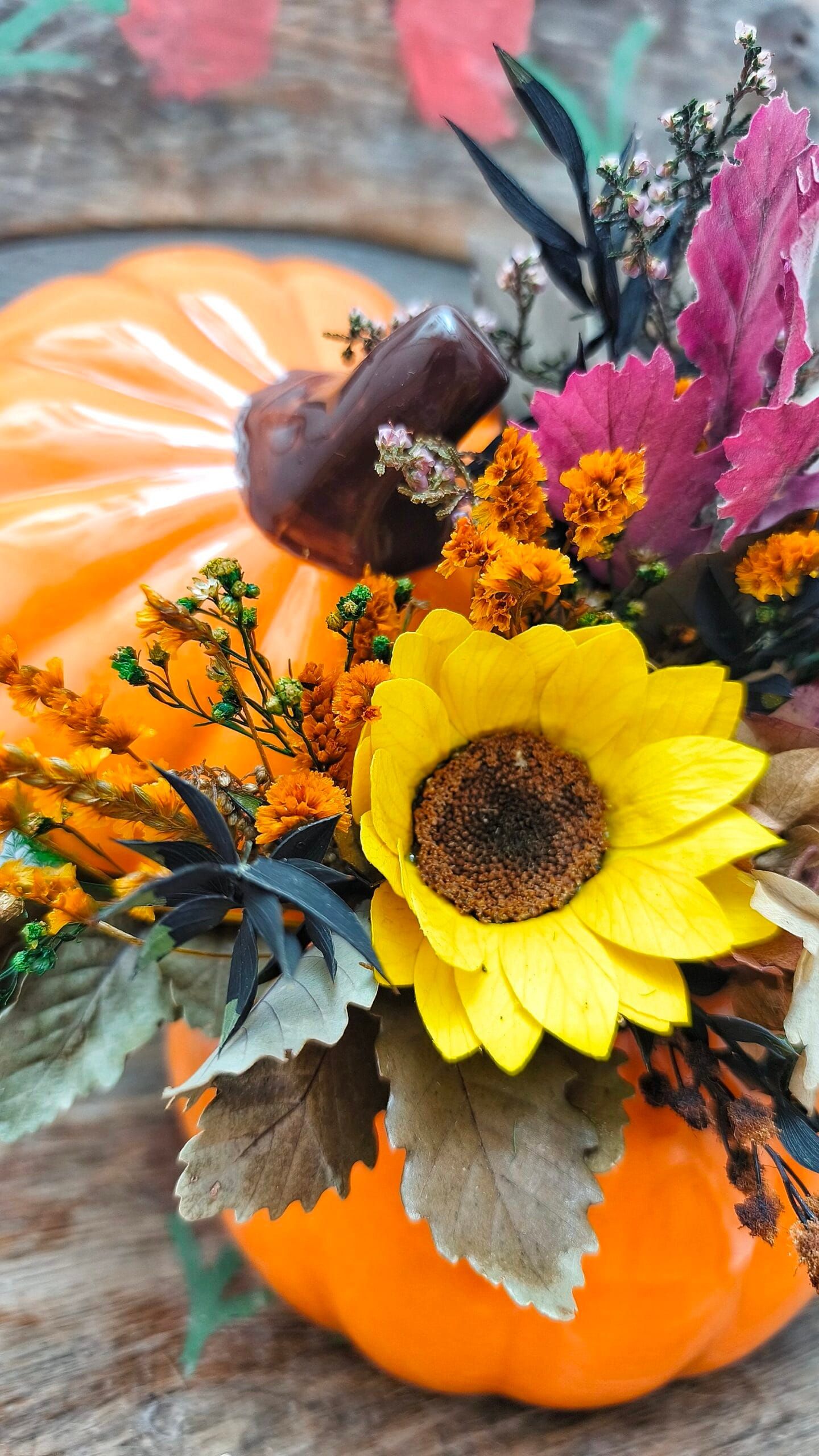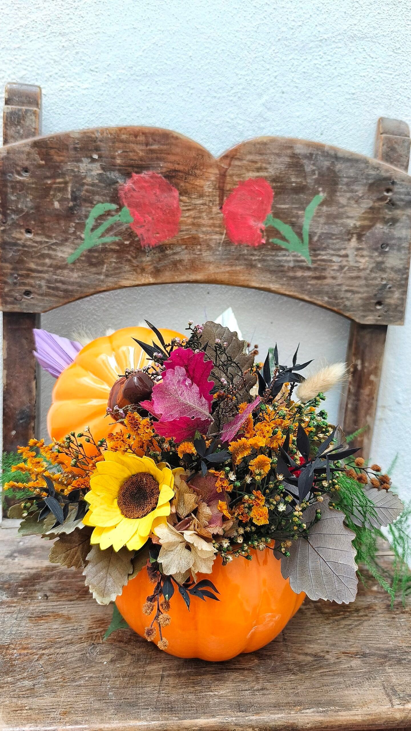 Calabaza de cerámica realizada con composición de flores preservadas variadas. Es una creación única, no hay una igual como la mayoría de nuestras creaciones.