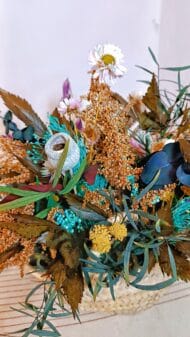 Este hermoso capazo de flores combina la elegancia de las flores preservadas y secas en un arreglo encantador. En él se encuentran margaritas blancas, achillea, avena y una variedad de flores de colores como azul, verde y morado. Las hojas secas en tonos marrones y verdes, junto con ramas y otros elementos vegetales, añaden textura y profundidad al conjunto.