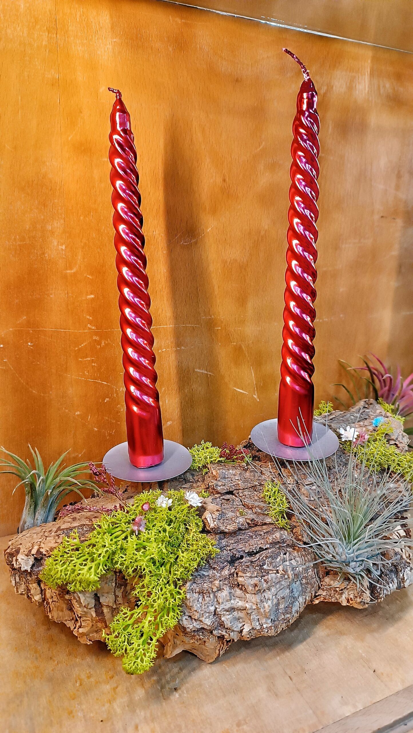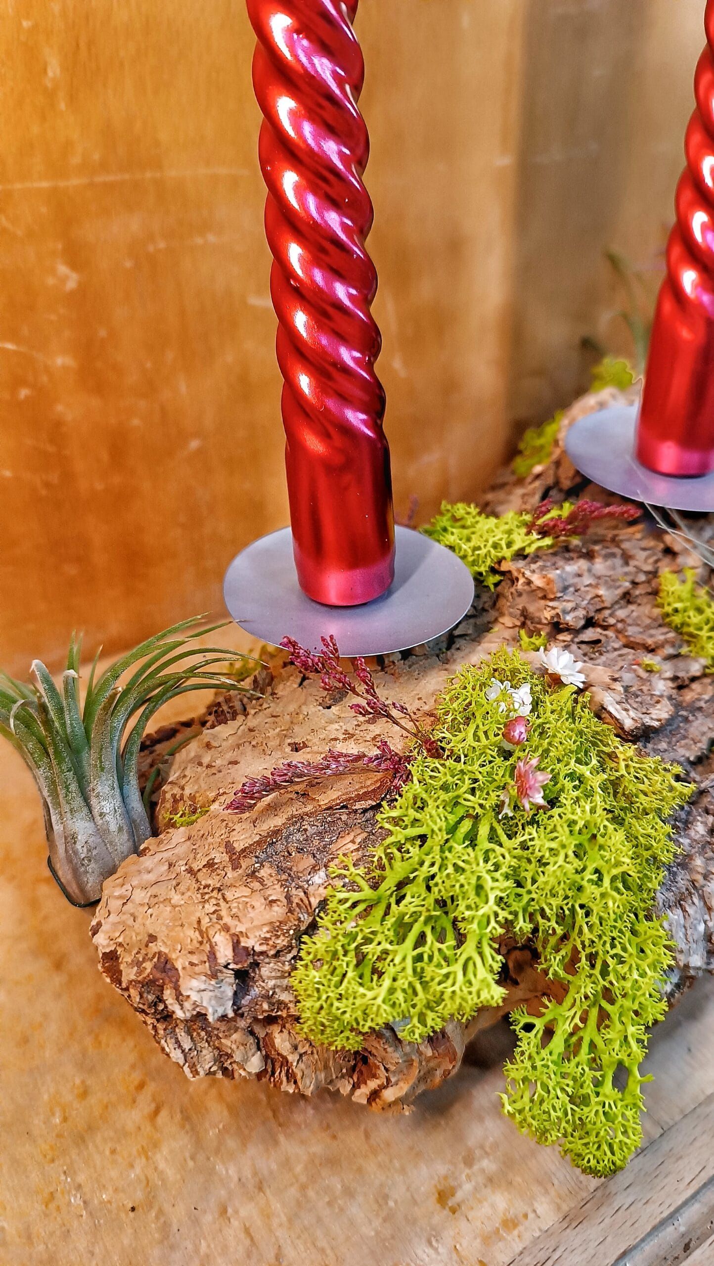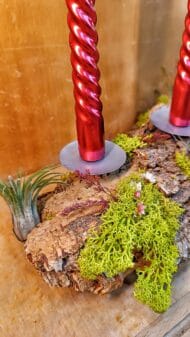 Centro de Mesa con Corcho, Musgo Preservado, Tillandsias y Velas Rojas: Un Toque Natural y Elegante