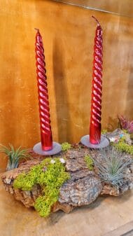 Este hermoso centro de mesa está diseñado para añadir un toque natural y sofisticado a cualquier ocasión especial. La base del arreglo está hecha de corcho natural, conocido por su textura única y su capacidad para complementar cualquier decoración. Sobre la base, se encuentran dos velas rojas con un elegante diseño en espiral, que aportan calidez y un toque festivo.