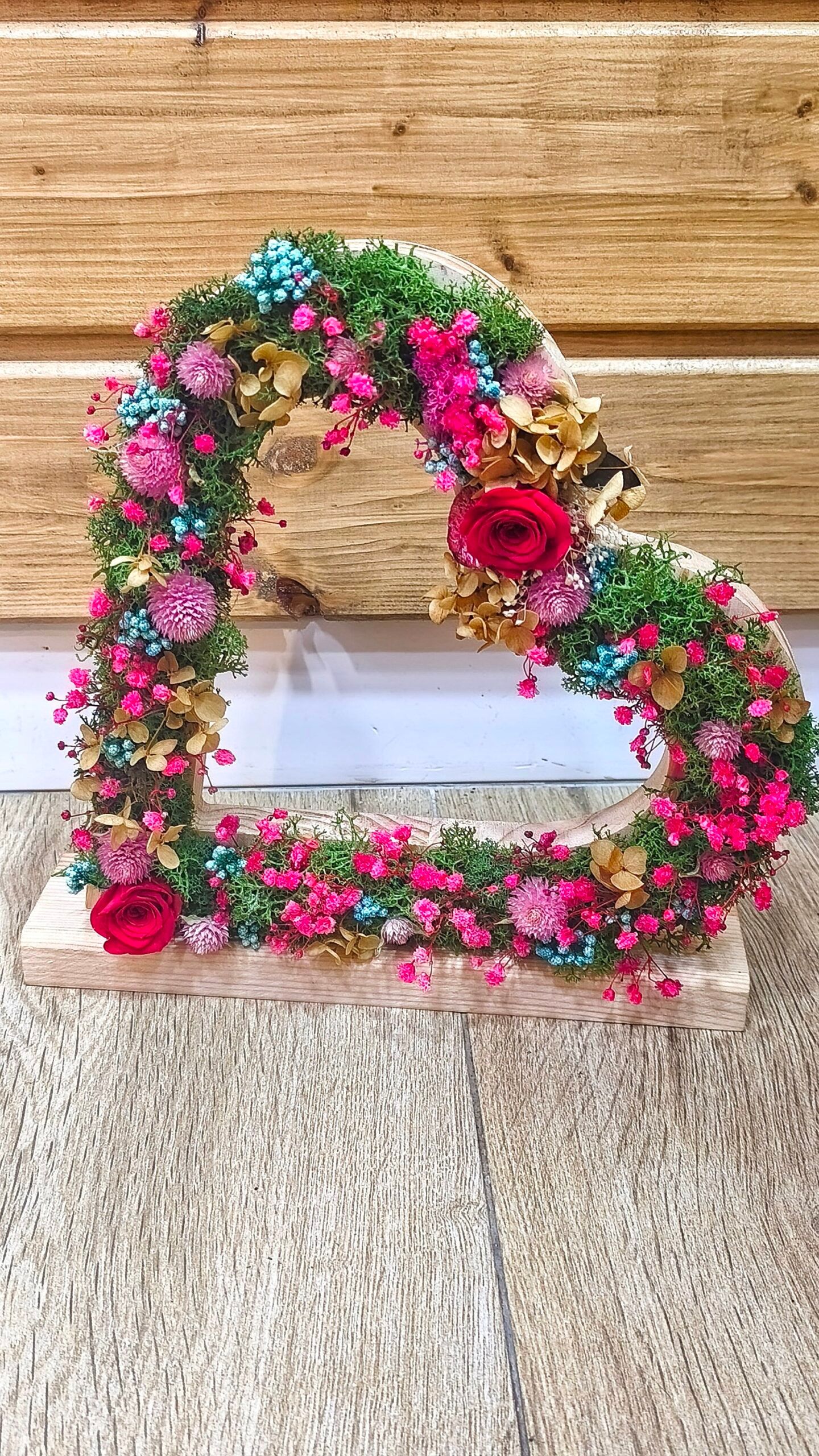 Corazón de madera relleno de flores preservadas y secas. Todo es artesano hecho a mano.