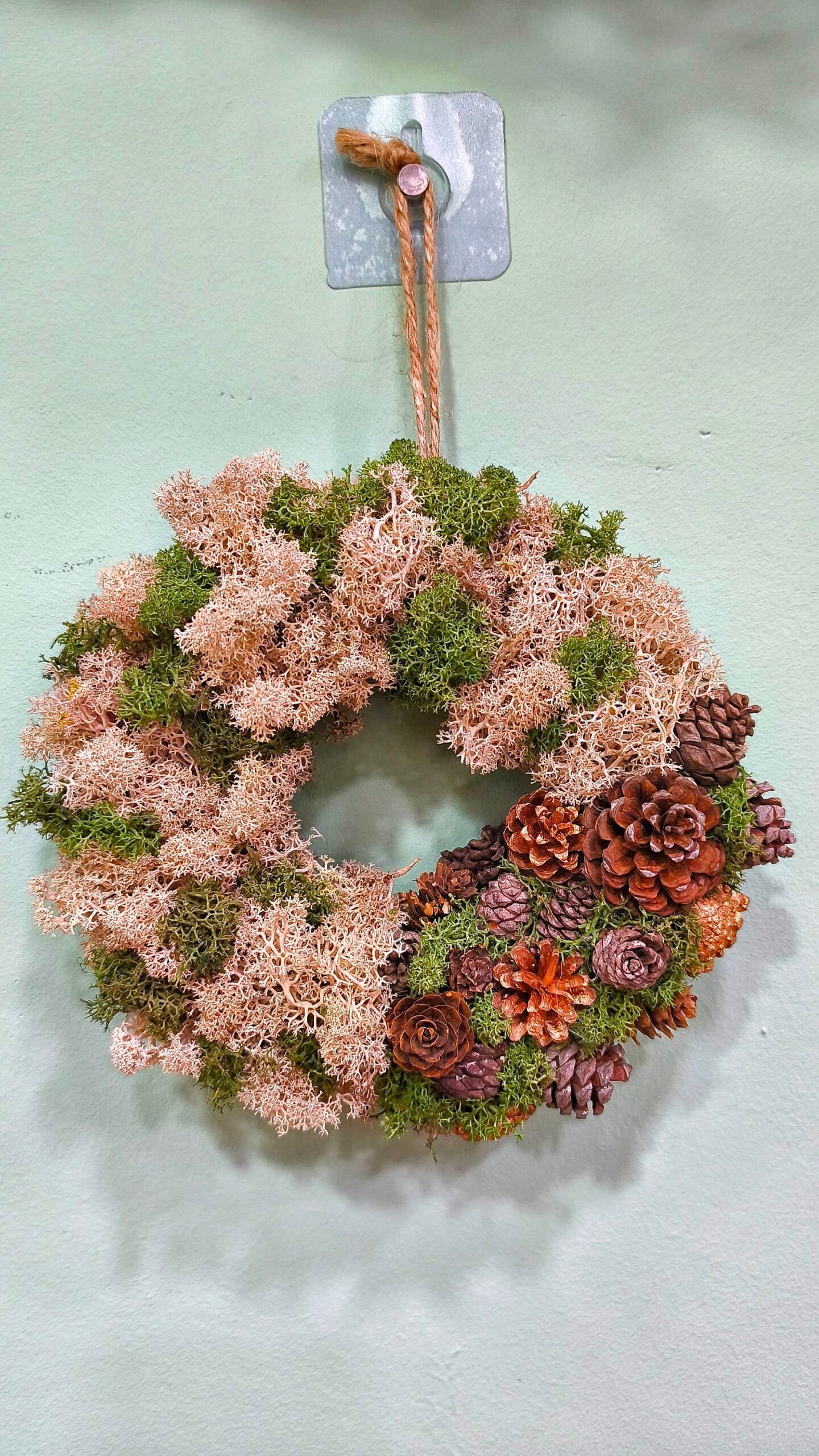 Compuesta por un aro forrado con tela de yute, eucalipto, astilbe y musgo preservados y avena, piñas y frutas secas.