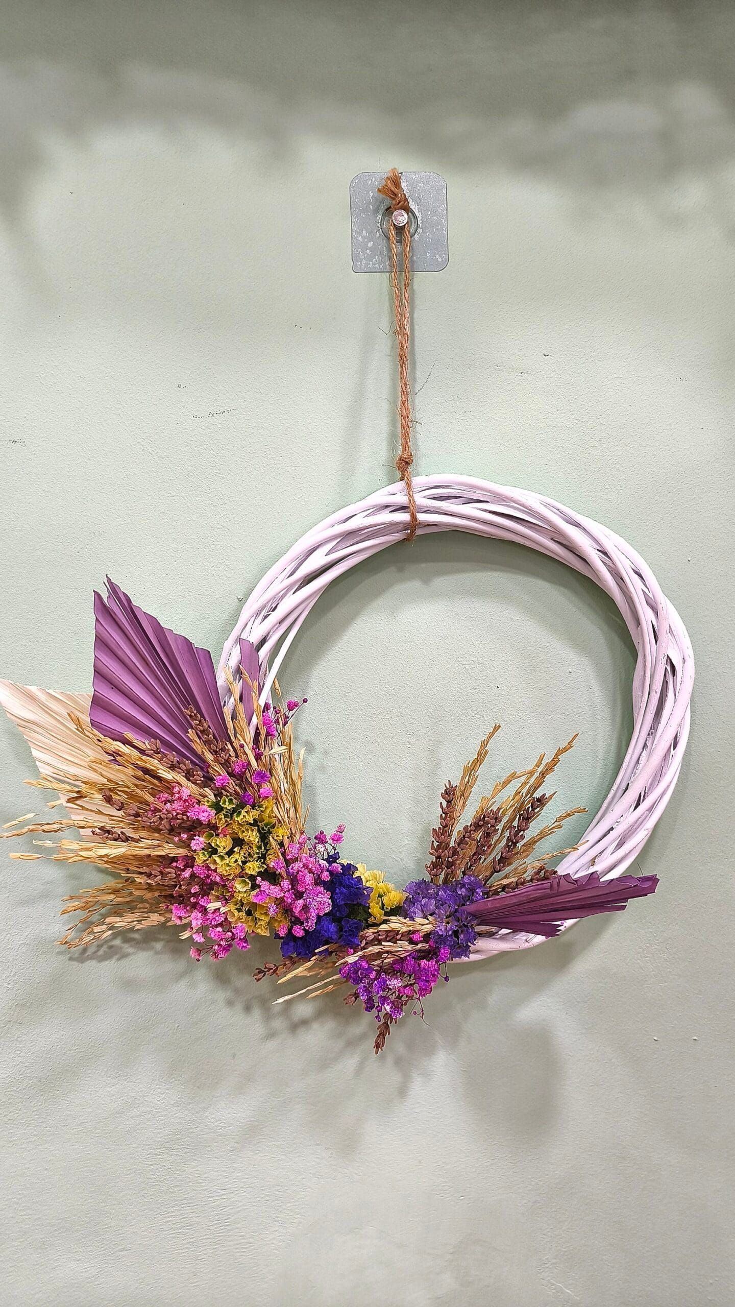 Corona natural blanca con flores preservadas, colores blancos, rosados y morados.