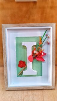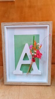 Inicial a elegir, enmarcada con un ramito de flores preservadas. Incluye la etiqueta con los datos del enlace. 20 x 15 cm aprox.