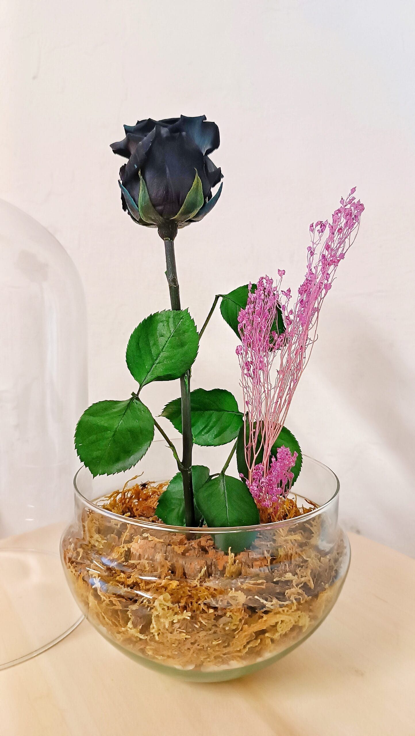 Rosa preservada con su tallo, Paniculata Mini Morada, musgo natural seco. Cristal soplado de gran calidad.