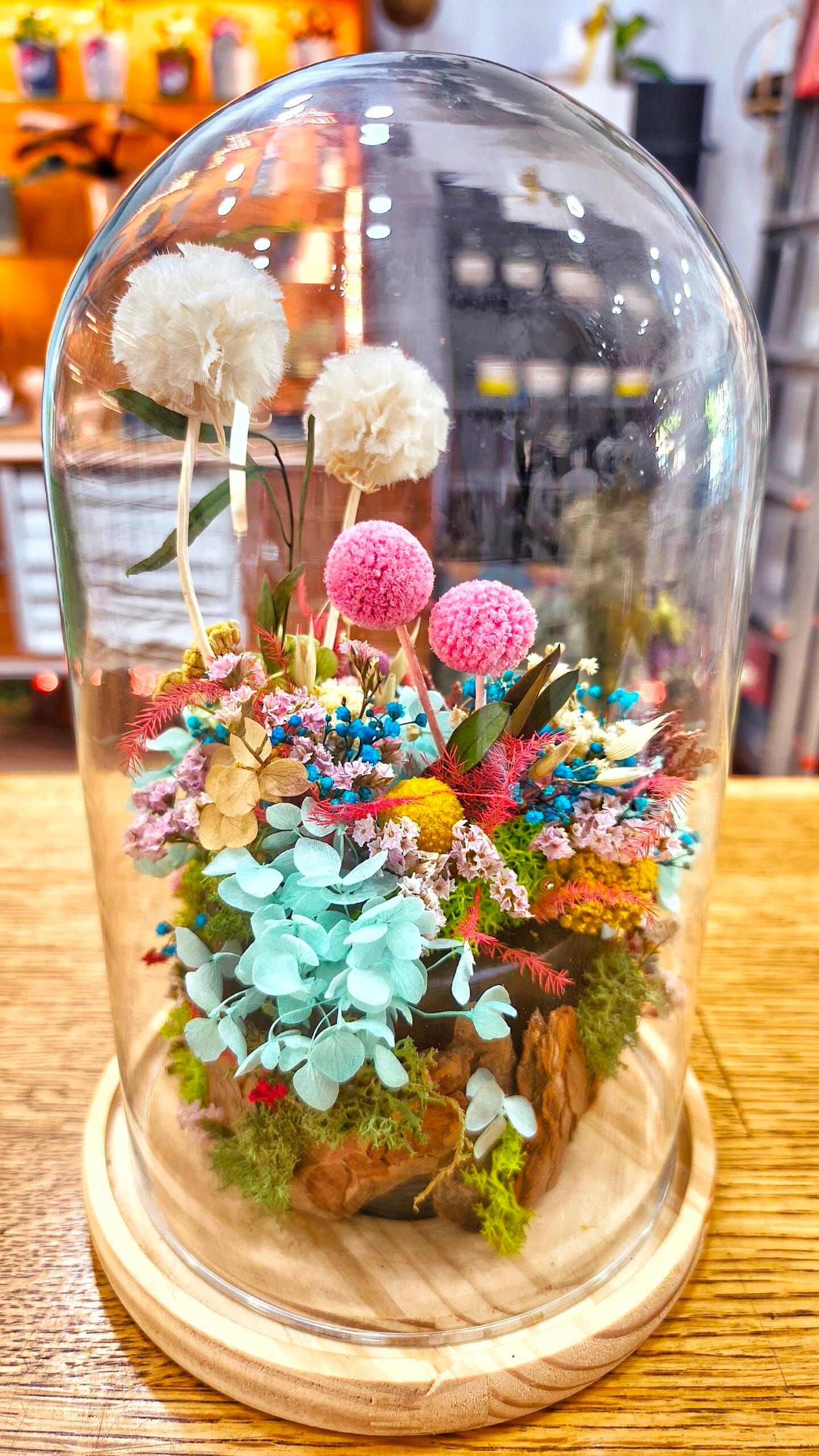 Cúpula funeraria «Salix»de flores preservadas, las cuales están sometidas a un proceso de embalsamado para que duren muchísimos años sin mantenimiento. Es nuestra cúpula más pequeña.