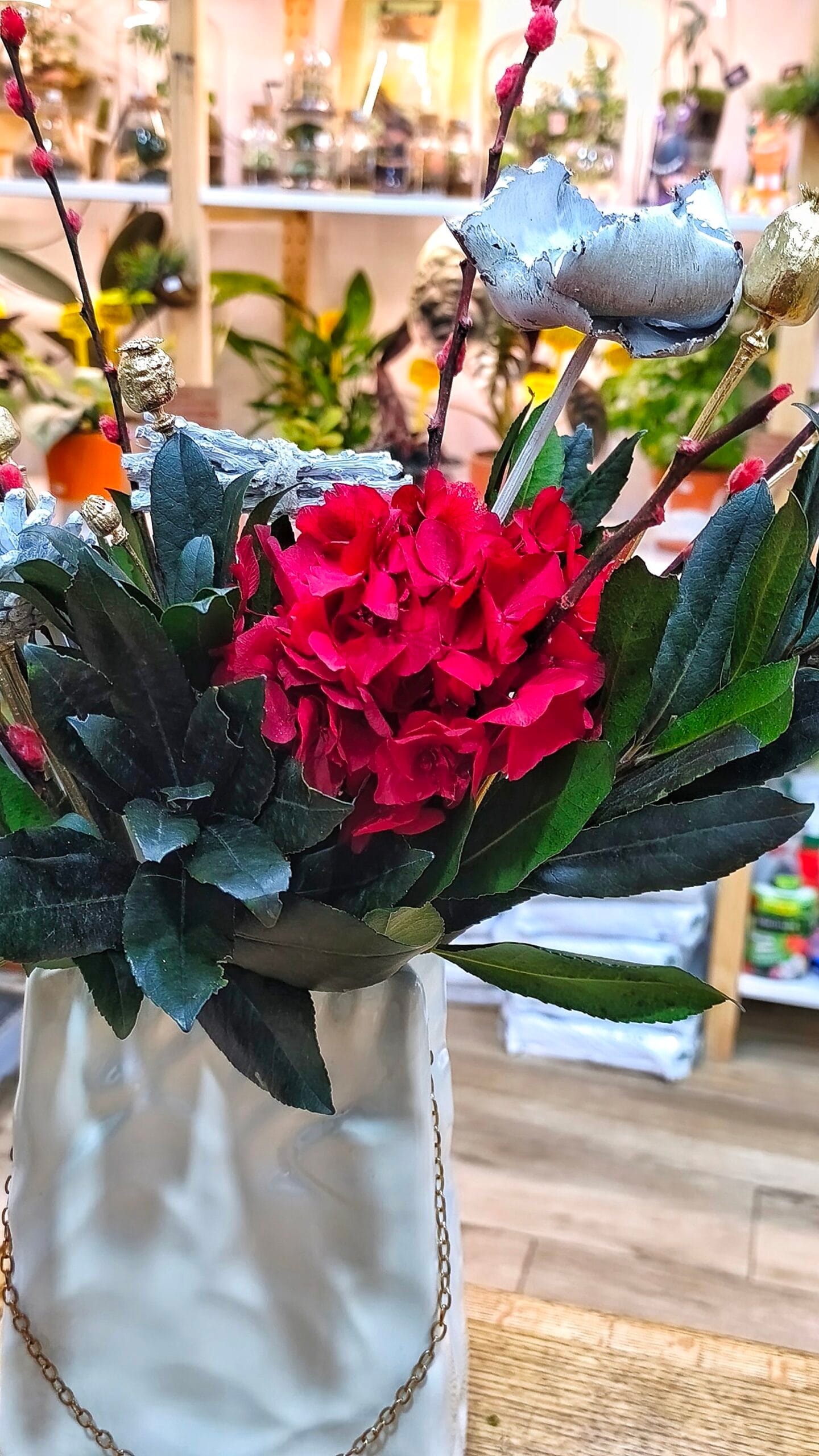 Todo el montaje lo hacemos en nuestro taller y no hay uno igual. Elaborado con flores preservadas. Jarrón de Cerámica portuguesa.