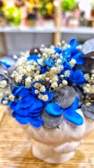Jarrón de cerámica, forma de niña. Elaborado con flores preservadas.