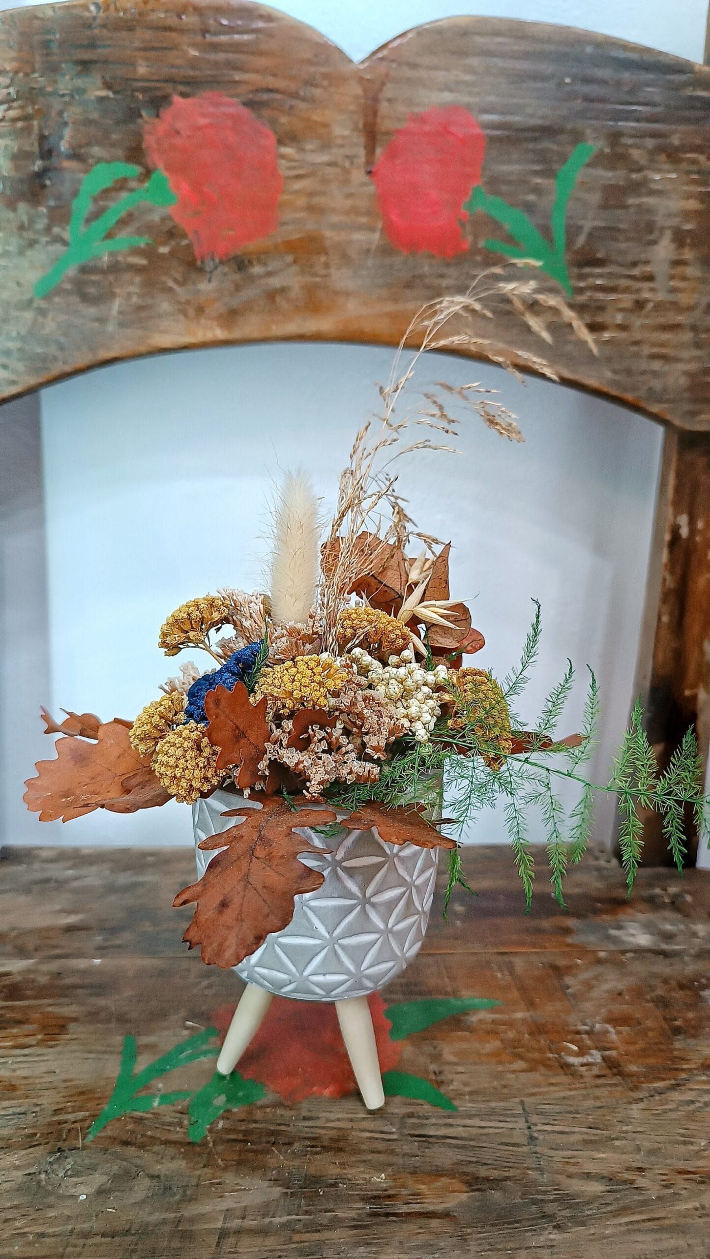 Macetita de cerámica con patas de madera. Compuesta por flores preservadas y secas.