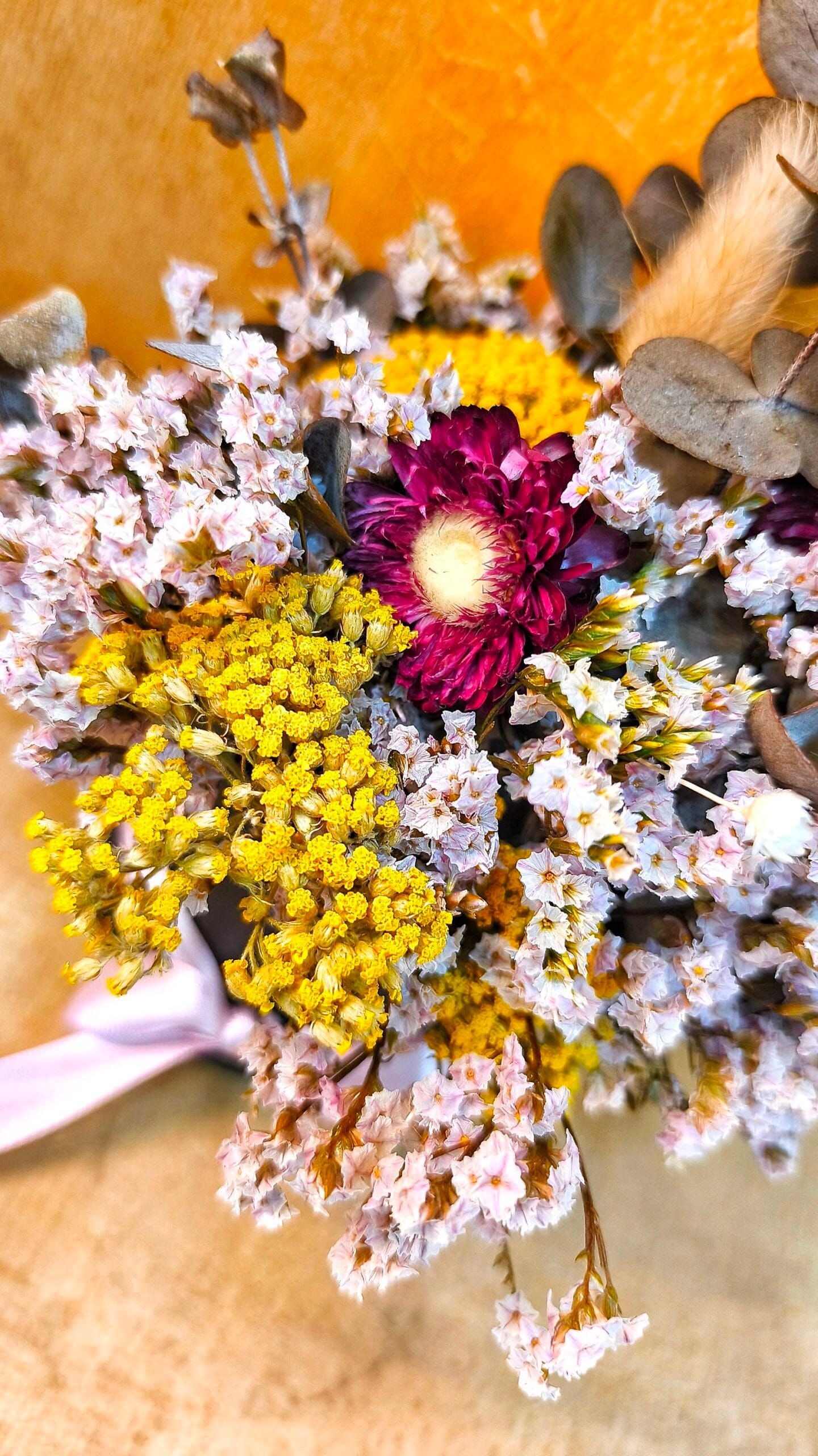 Hecho a mano con flores preservadas y secas. Tonalidades Multicolores. Cajita con tapa debajo de color negro.