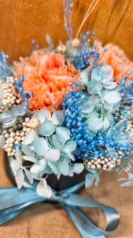 Hecho a mano con flores preservadas y secas. Tonalidades azules. Cajita con tapa debajo de color negro.