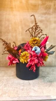 Hecho a mano con flores preservadas y secas. Tonalidades rojizas. Cajita con tapa debajo de color negro.