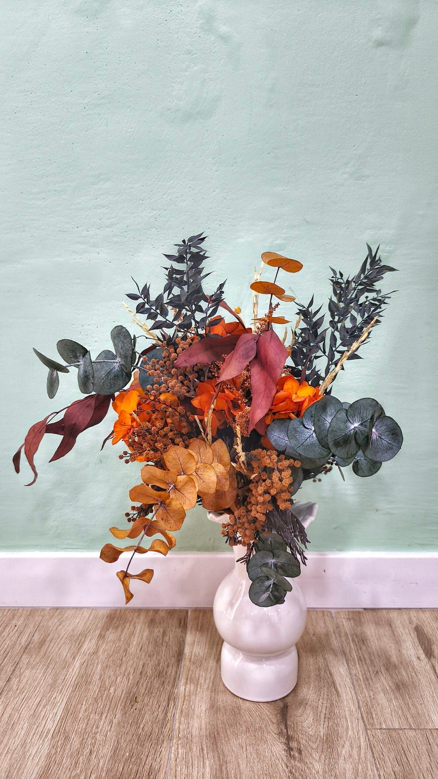 Ramo de flores preservadas, compuesto diversos eucaliptos, ruscus, hortensia y mimosa. Precioso tanto para una boda como para decorar un rincón de la casa.