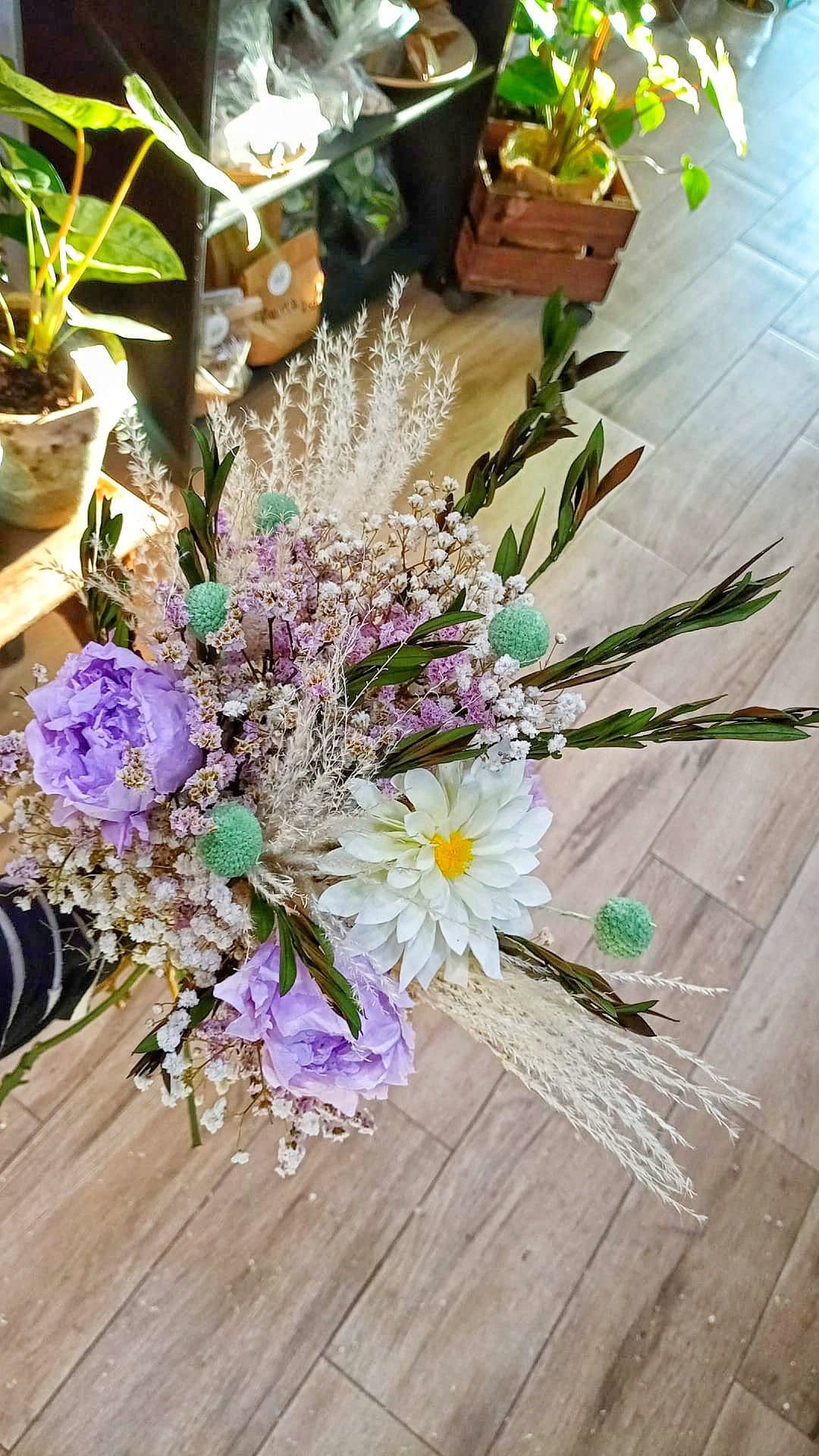 Ramo compuesto por flores preservadas; peonía color lavanda, Dalia blanca, limonium rosa, paniculata blanca, craspedia mint, miscanthus blanco, olivo.