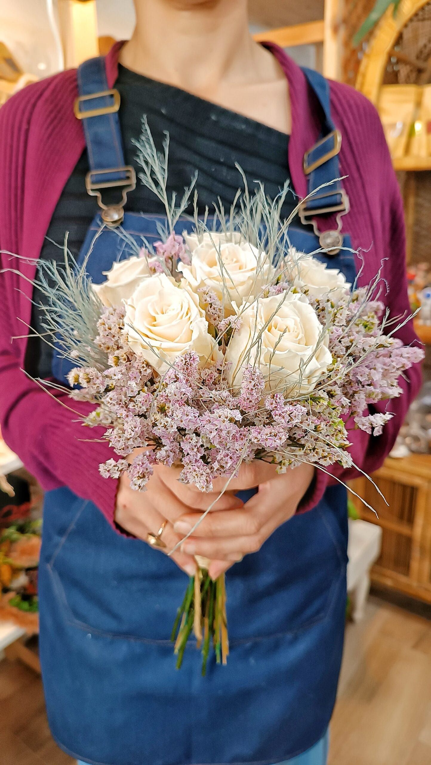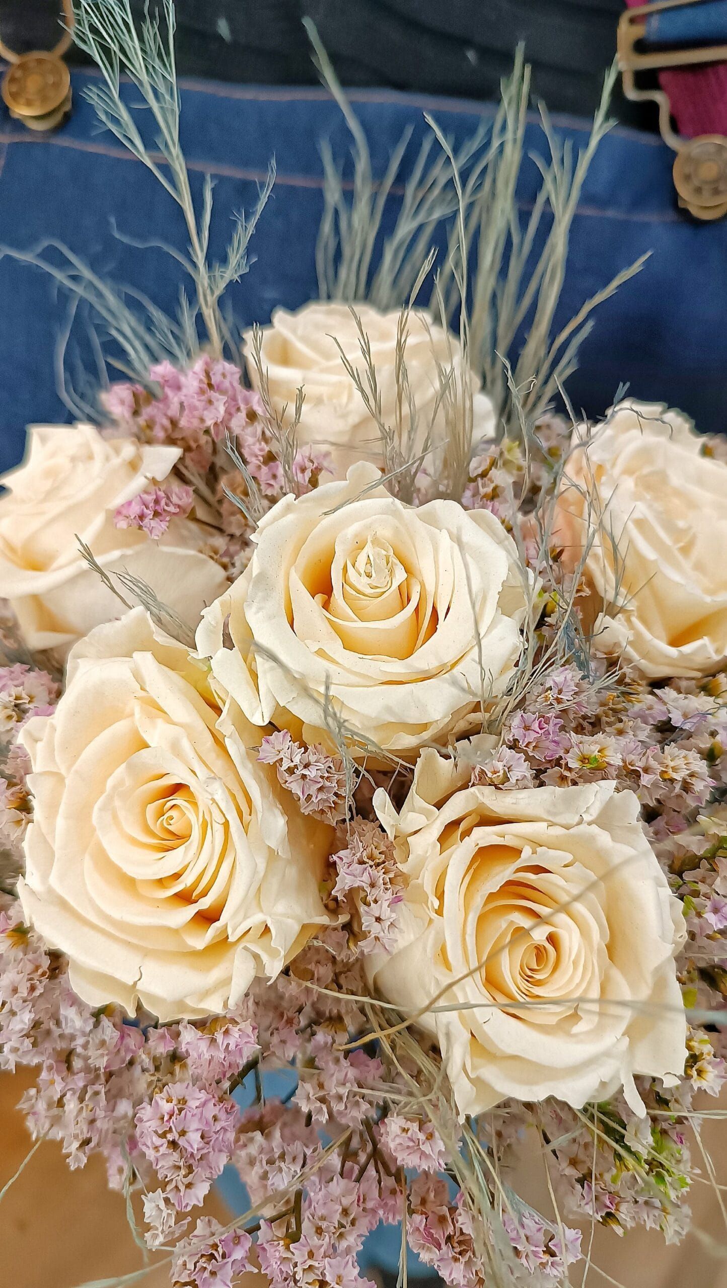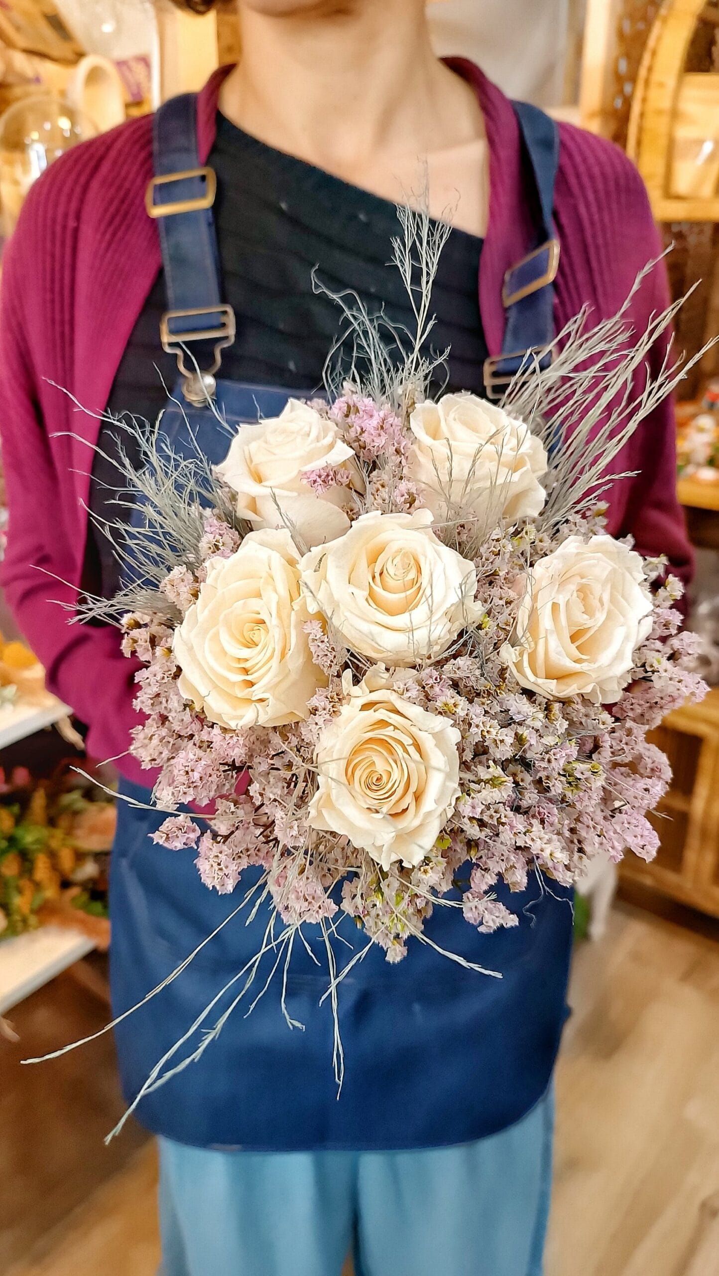 Para novia, compuesto por Rosas Champagne, Limonium Rosa y Esparraguera Azul, todas preservadas. Es nuestro buque insignia. Un ramo precioso, sencillo que pasará desapercibido. Y te durará años.