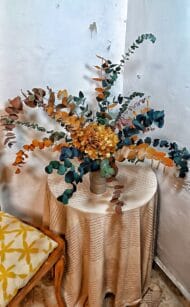 Este elegante ramo de flores preservadas combina la frescura del eucalipto con la belleza vibrante de la hydrangea. Las hojas de eucalipto, en una paleta de tonos verdes, azules, naranjas y marrones, se extienden en ramas largas y delgadas, creando una estructura visualmente dinámica y atractiva. El centro del ramo está adornado con flores de hydrangea en colores amarillo y naranja, cuyos pétalos pequeños y delicados aportan un toque de suavidad y color al conjunto.