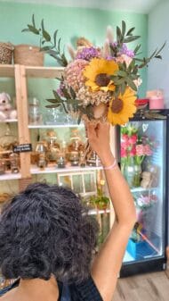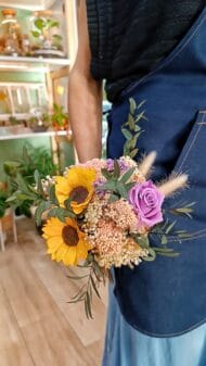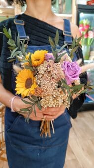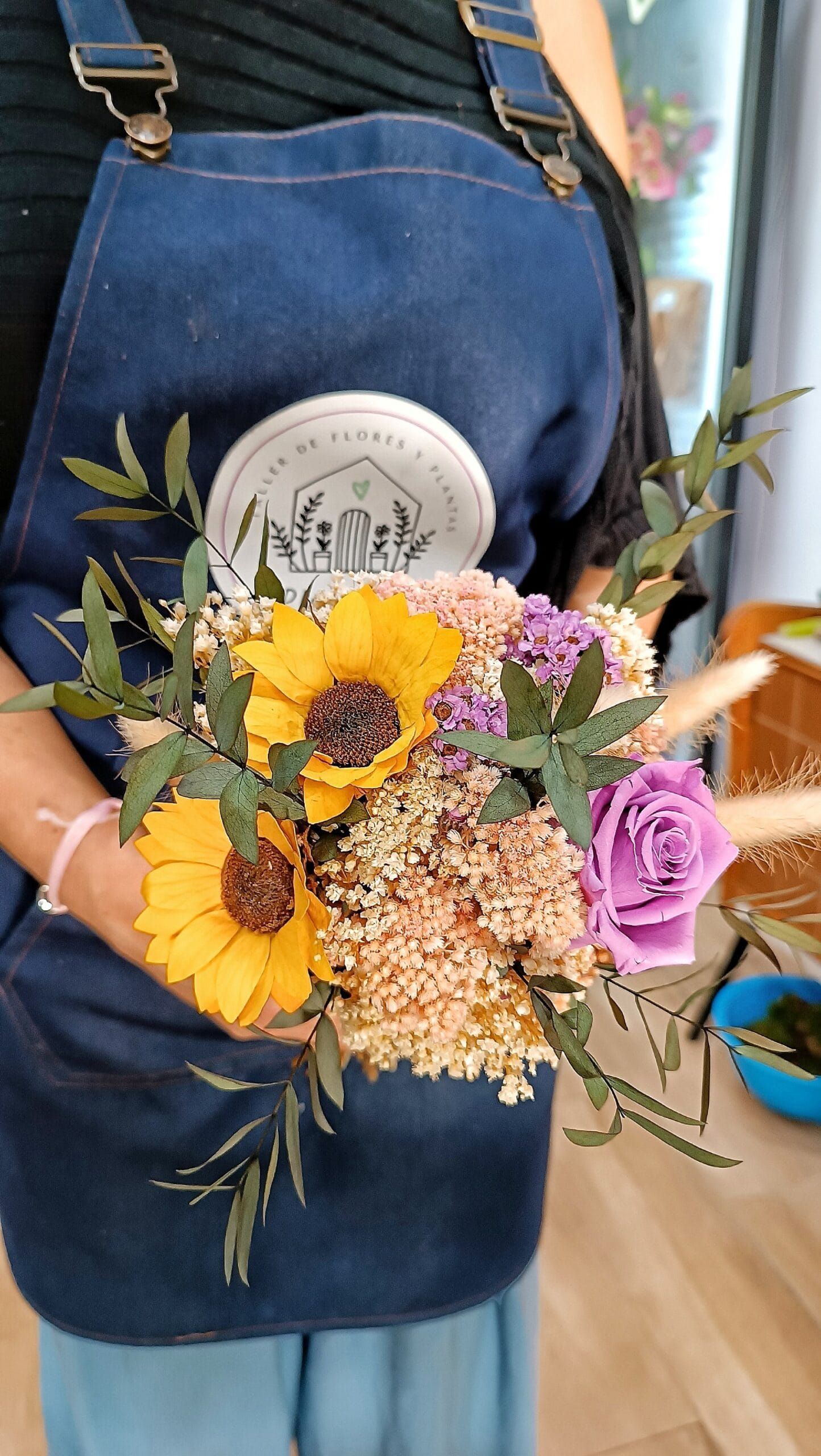 El ramo de novia Sunny, está compuesto por Paniculata Blanca, Achillea Rosa, Girasoles, Eucalipto, Rosa Lavanda y Oxodia Morada y Lauguru Natural, todo preservado para que te dure años el ramo.