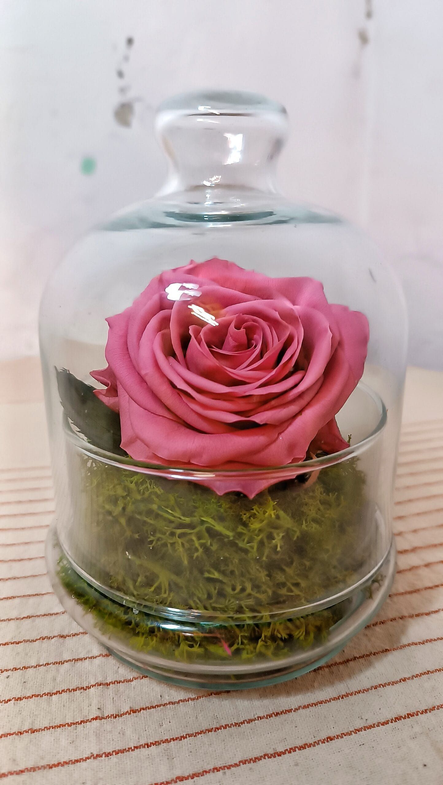 Rosa preservada, musgo natural preservado. Cristal soplado de gran calidad. Se abre en 2 piezas.