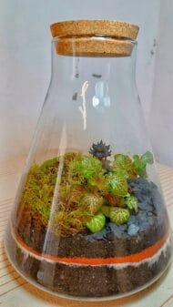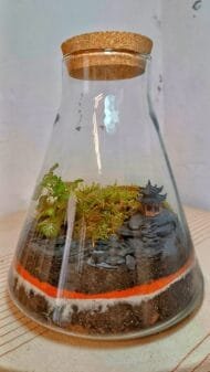 Compuesto por fitonia, pilea, musgo plano, musgo bola, piedras de pizarra y de atrezzo un templo oriental.